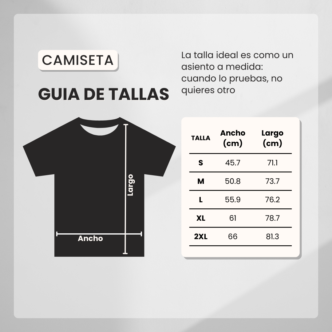 Así como cada coche tiene sus medidas exactas, tu camiseta también debe ajustarse a ti. Usa la guía de tallas para encontrar tu ajuste perfecto y lleva contigo el diseño que demuestra tu pasión por la velocidad.